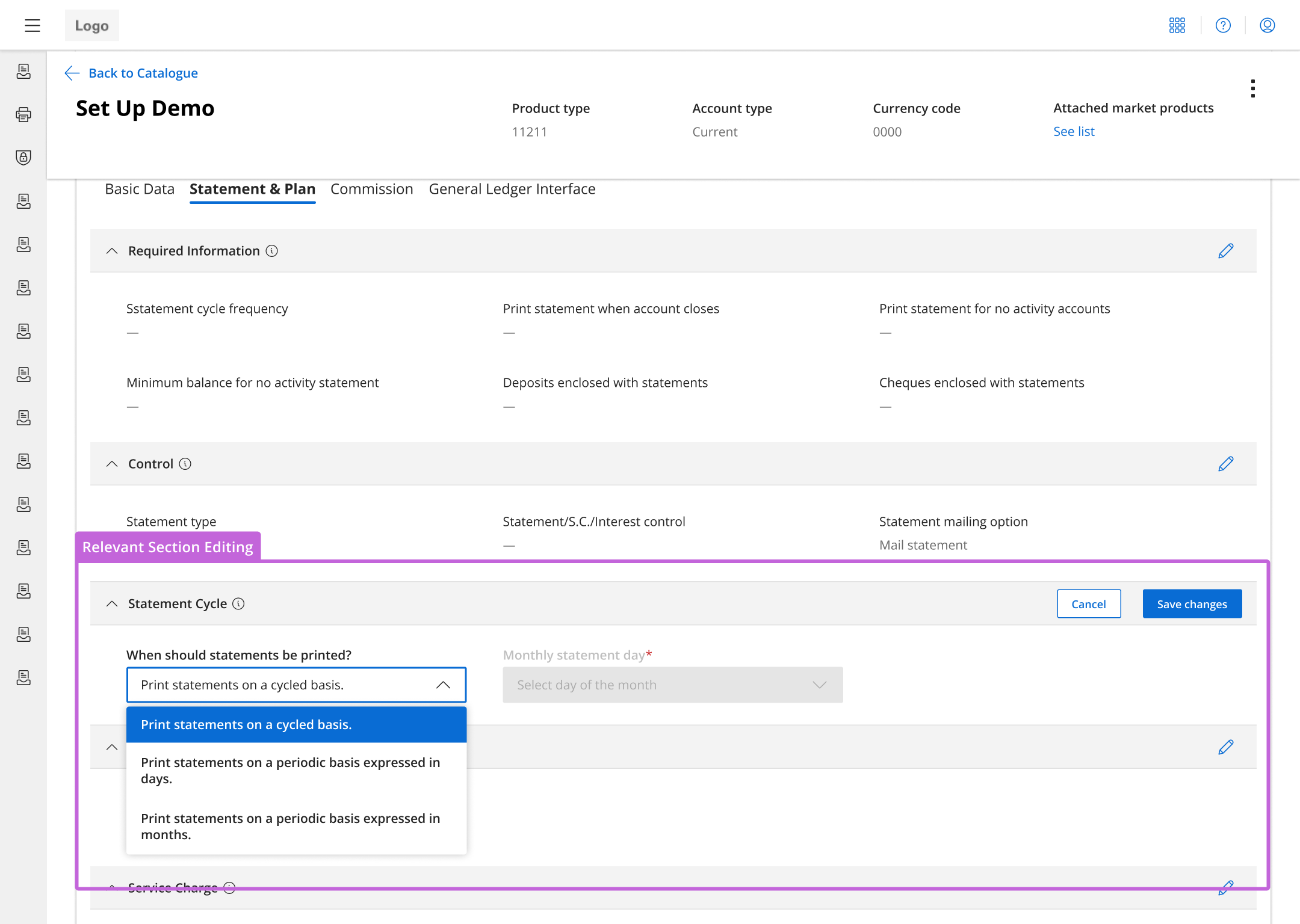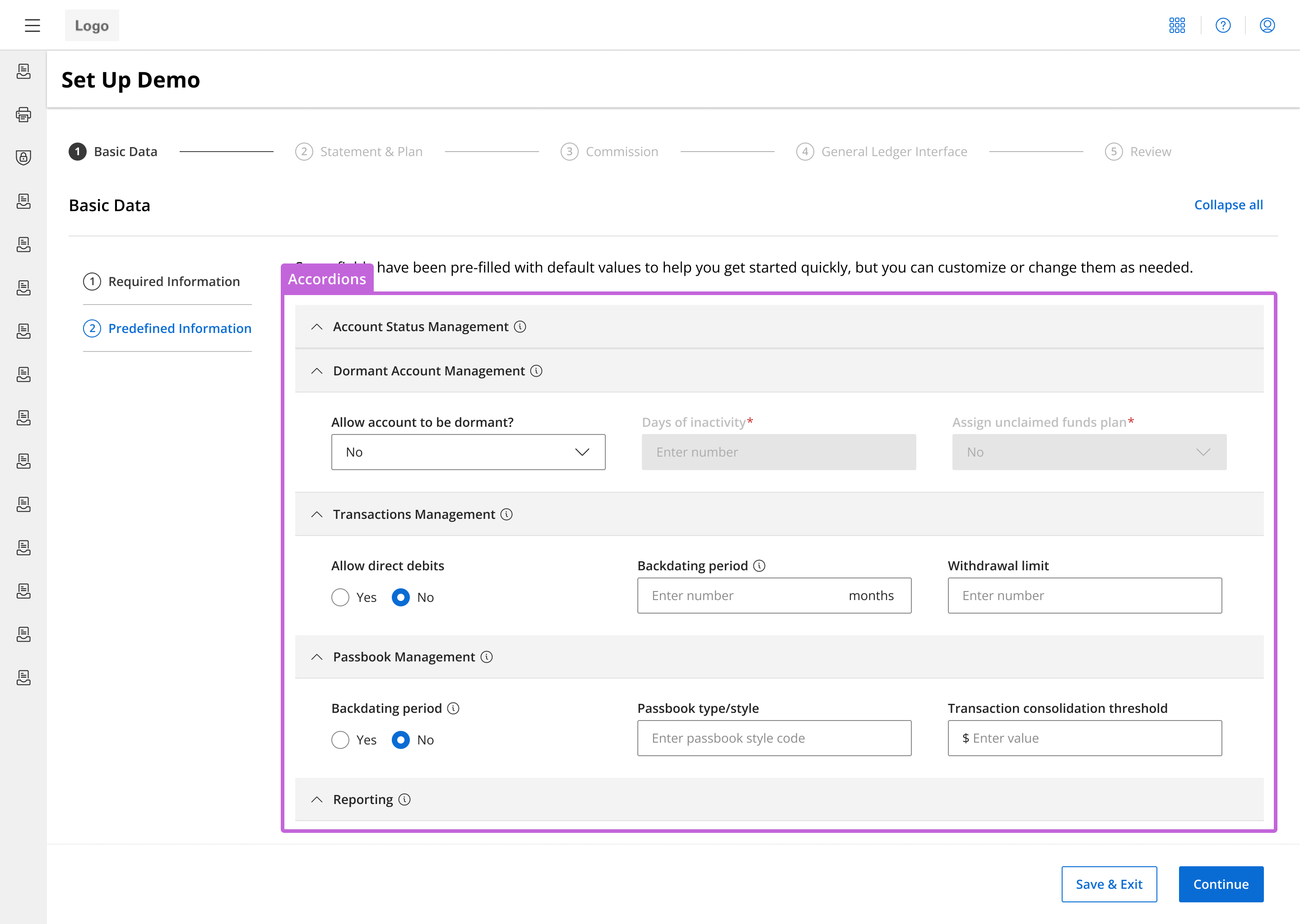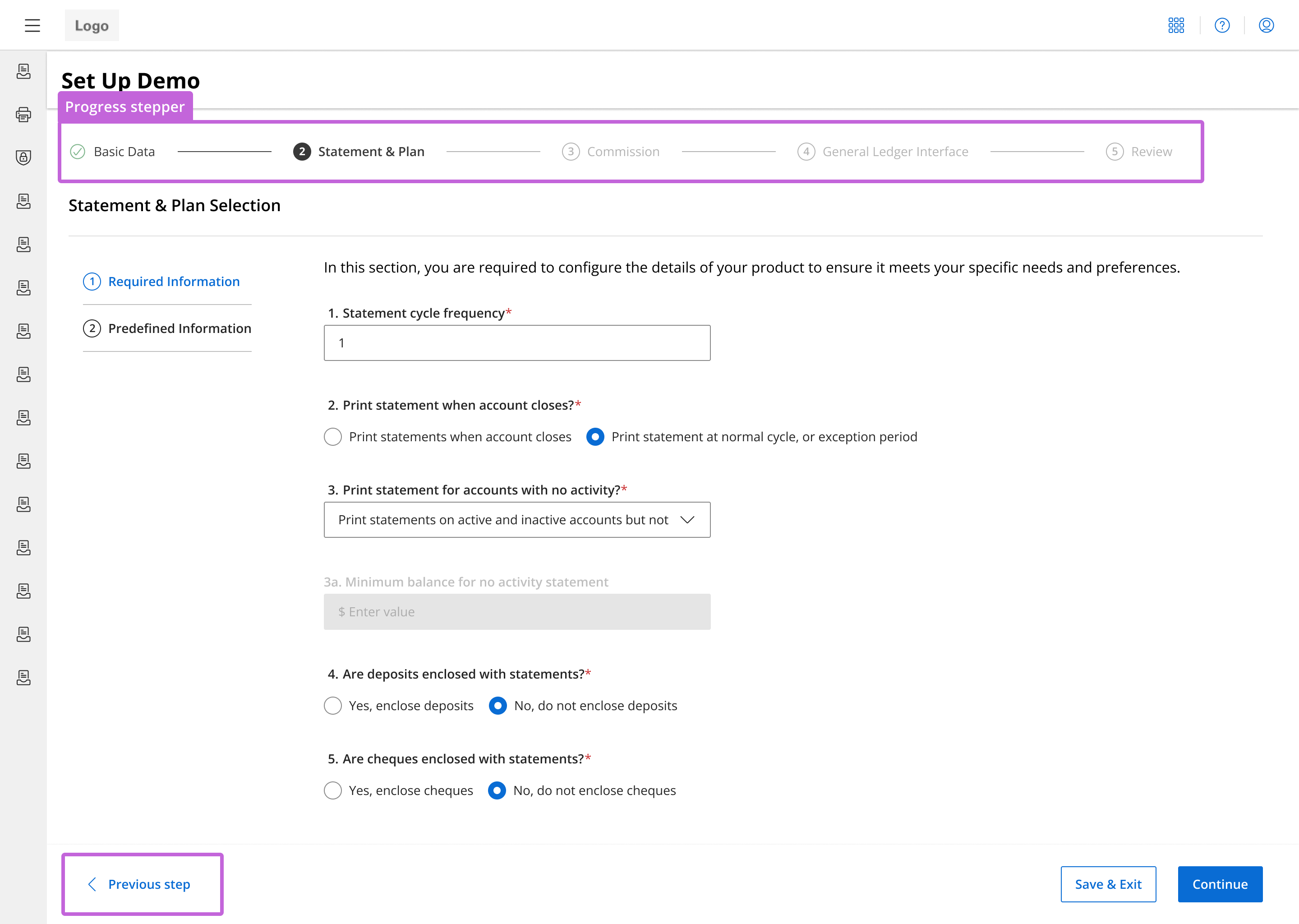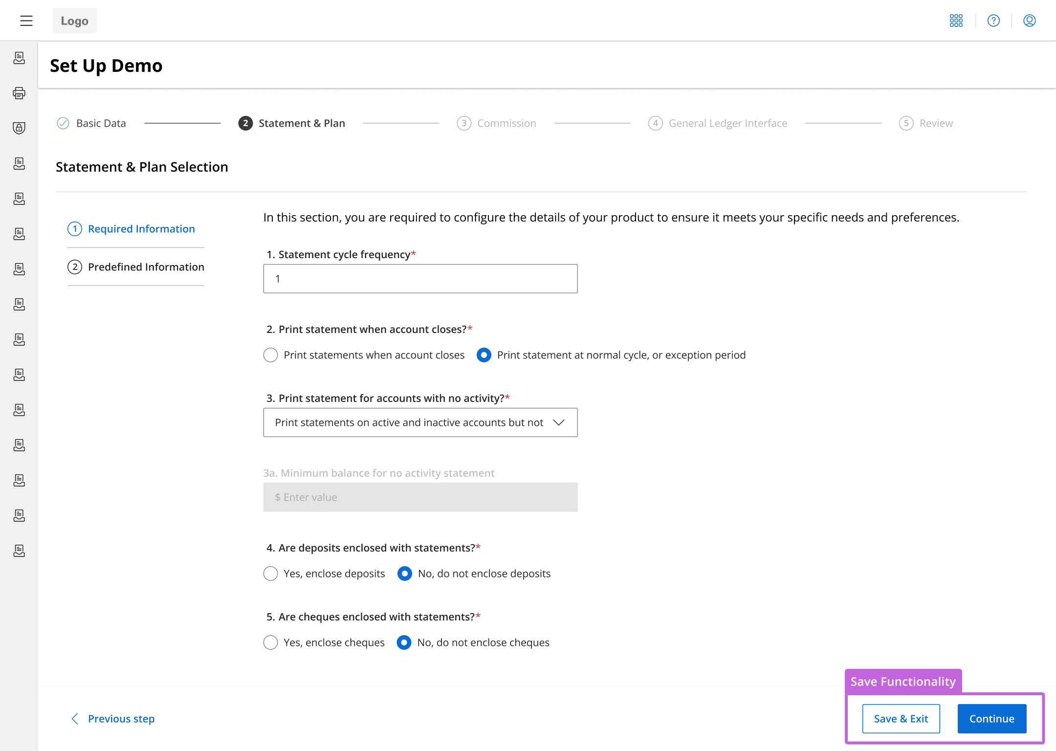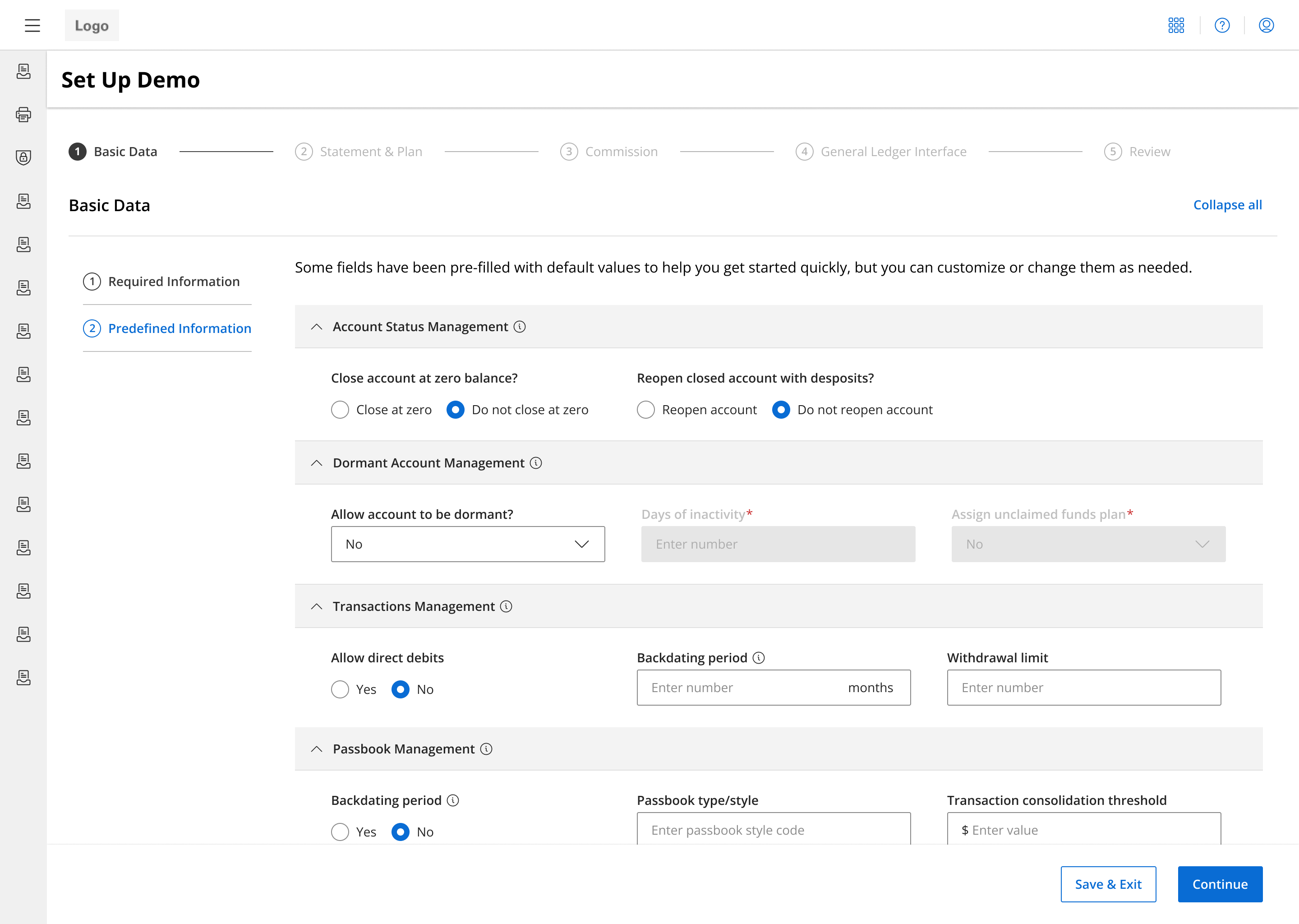 - Users can click 'Save & Exit' which will save their progress and take them back to the catalog page with the list of existing checking account products. When they want to resume, they will return to where they last stopped.